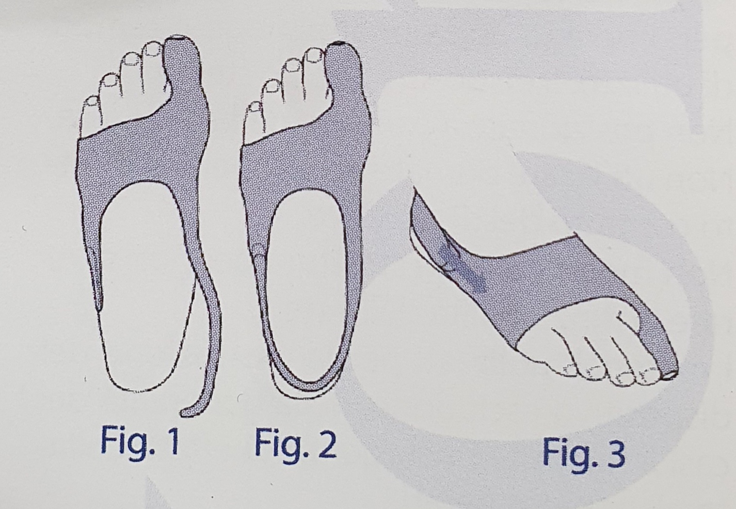 Open the adaptable part completely. Pass the front of the foot through the strap, placing the big toe on the special open-ended cover (Fig. 1). Pass the strap behind the ankle and close it (Fig.2). The more you close the strap the more you align the big toe (Fig.3). In the first few days do not align it too much. Increase gradually after 7-10 days until your big toe is aligned.